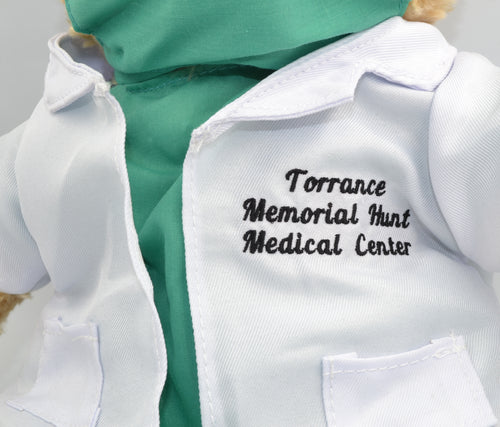 Yes! You can embroider anything you want onto the surgical cap or the doctor's coat by checking the boxes under the "Personalize your bear" text above.