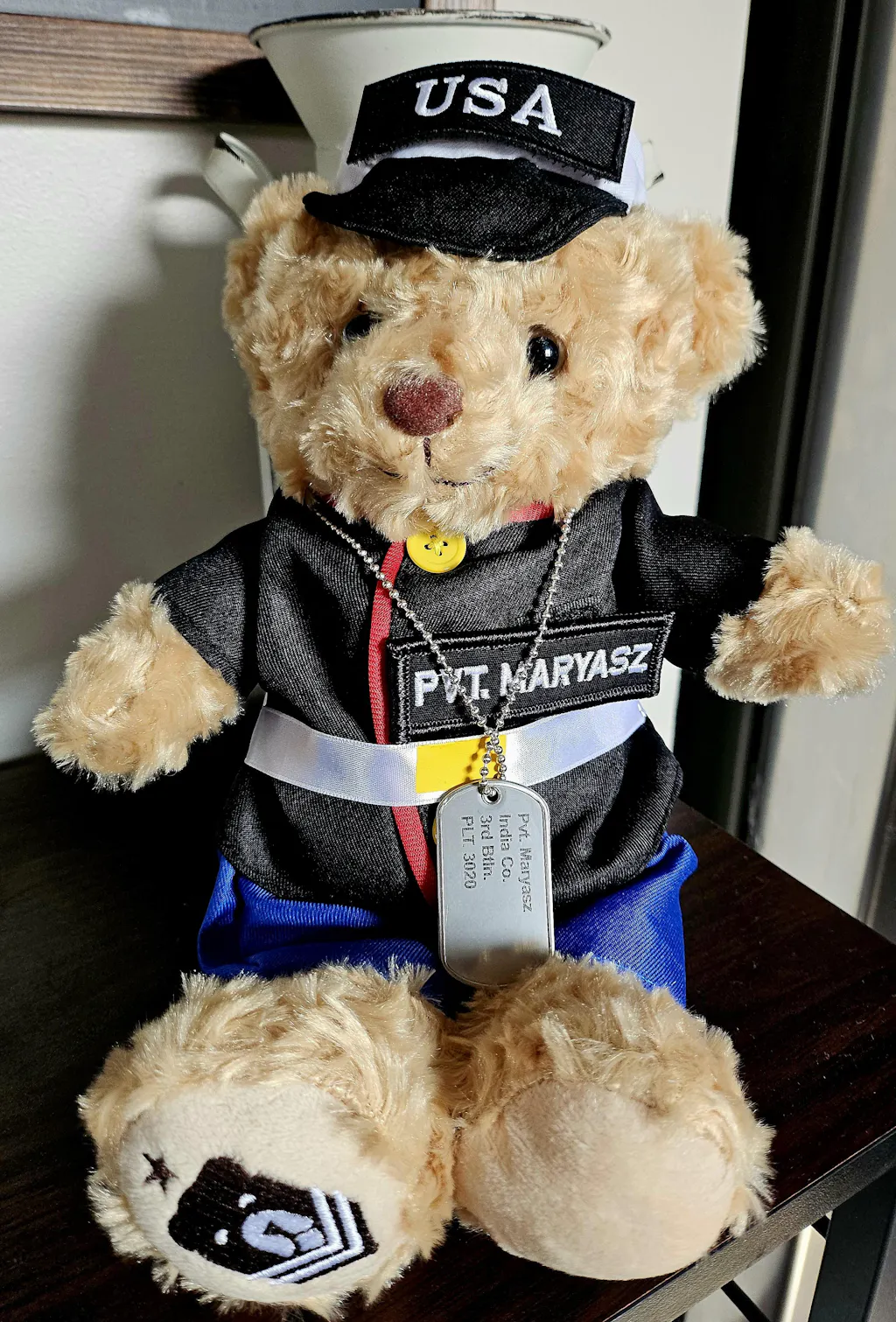 I had made one for my husband while I was overseas, and the day after delivery he passed away, I buried his bear with him so he always has me with him. He loved it for that whole time he was still here and thank you for bringing that joy to him. He cried when he opened the package and he took him everywhere that day and I’m just at a loss of words for it, my husband may have been 19 almost 20 but it didn’t change how much he loved that bear. So thank you all so much.